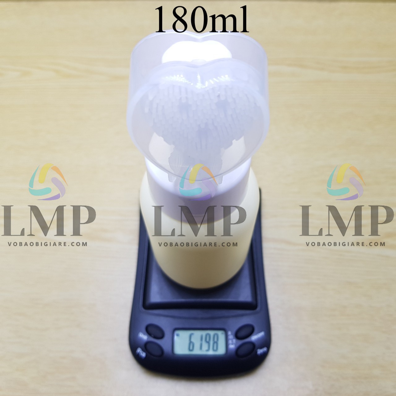 Màu sắc : Thân chai màu vàng sữa nhám kết hợp đầu massage hình tim và nắp chụp màu trong suốt bảo vệ cọ massage không bị bụi
